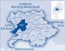 Giessen, spelled Gießen in German (German pronunciation: [ˈɡiːsn̩] ⓘ), is a town in the German state (Bundesland) of Hesse, capital of both the district of Giessen and the administrative region of Giessen. The population is approximately 90,000, with roughly 37,000 university students.[3]