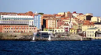 Gijón (Spanish: [xiˈxon] ⓘ) or Xixón (Asturian: [ʃiˈʃoŋ]) is a city and municipality in north-western Spain. It is the largest city and municipality by population in the autonomous community of Asturias. It is located on the coast of the Cantabrian Sea in the Bay of Biscay, in the central-northern part of Asturias; it is approximately 24 km (15 mi) north-east of Oviedo,[3] the capital of Asturias, and 26 km (16 mi) from Avilés. With a population of 270,219 as of 2024, Gijón is the 16th-largest city in Spain.[2]