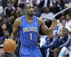 On December 18, 2010, Arenas was traded to the Orlando Magic for Rashard Lewis.[51] Arenas was reunited with former Warriors teammate and draftmate Jason Richardson in Orlando. Arenas chose to wear #1 on his jersey in honor of his favorite player, Penny Hardaway. He was the backup point guard, with Jameer Nelson at the starting role.[52] The Magic finished 52–30 and clinched the fourth seed in the Eastern Conference and made the playoffs. However, Orlando lost to the Atlanta Hawks in six games in the opening round of the playoffs.