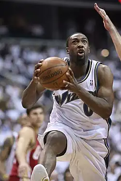 Arenas was a three-time NBA All-Star, three-time member of the All-NBA Team during his time in Washington, and was voted the NBA Most Improved Player in the 2002–03 season in his final season in Golden State. Arenas was nicknamed "Agent Zero" while playing with Washington, due to his jersey number (0).[1] He was also nicknamed "Hibachi" for "cooking" his opponents. Both names quickly became fan favorites during his time in the Washington, D.C. area.[2] Arenas played the shooting guard and point guard position.