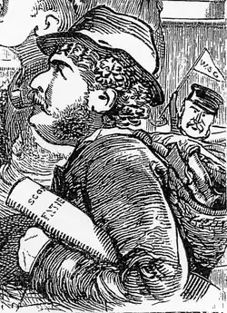 Sullivan's first foray into comic opera was Cox and Box (1866), written with the librettist F. C. Burnand for an informal gathering of friends. Public performance followed, with W. S. Gilbert (then writing dramatic criticism for the magazine Fun) saying that Sullivan's score "is, in many places, of too high a class for the grotesquely absurd plot to which it is wedded."[19] Nonetheless, it proved highly successful, and is still regularly performed today. Sullivan and Burnand's second opera, The Contrabandista (1867) was not as successful.[20]