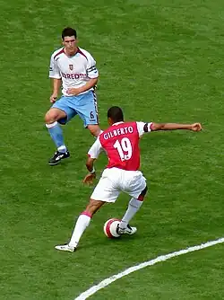 Gilberto's performance in the 2002 FIFA World Cup caught the attention of many coaches. Gilberto expressed a desire to move to England, saying, "It would be fantastic to play against the likes of David Beckham again."[19] As a result, FA Premier League clubs Aston Villa and Arsenal led the chase to sign him. In August, while still under contract to Atlético Mineiro, Gilberto joined Arsenal on their pre-season tour of Austria; while he had not yet signed for Arsenal the deal looked set to go ahead. However, complications arose when a transfer embargo was placed on Atlético Mineiro due to unpaid wages to some players at the club, including Gilberto.[20][21] There was also an issue of obtaining a UK work permit for Gilberto.[22] Despite the complications, Gilberto ended a summer of speculation and joined Arsenal on 7 August 2002 for a fee of £4.5 million. Upon signing Gilberto, Arsenal manager Arsène Wenger said, "What I like was the fact that he kept things simple. He can play all across the midfield but the holding role just in front of the defence is what he does best."[20][23]