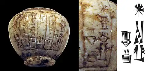Most historians generally agree that Gilgamesh was a historical king of the Sumerian city-state of Uruk,[17][18][19][20] who probably ruled sometime during the early part of the Early Dynastic Period (c. 2900–2350 BC).[17][18] Stephanie Dalley, a scholar of the ancient Near East, states that "precise dates cannot be given for the lifetime of Gilgamesh, but they are generally agreed to lie between 2800 and 2500 BC".[18] An inscription, possibly belonging to a contemporary official under Gilgamesh, was discovered in the archaic texts at Ur;[21] his name reads: "Gilgameš is the one whom Utu has selected". Aside from this the Tummal Inscription, a thirty-four-line historiographic text written during the reign of Ishbi-Erra (c. 1953 – c. 1920 BC), also mentions him.[19] The inscription credits Gilgamesh with building the walls of Uruk.[22] Lines eleven through fifteen of the inscription read: