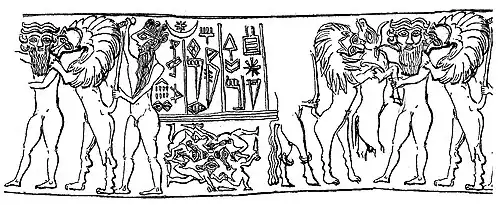 ![]() Possible representation of Gilgamesh as Master of Animals, grasping a lion in his left arm and snake in his right hand, in an Assyrian palace relief (713–706 BC), from Dur-Sharrukin, now held in the Louvre[1] | |