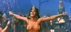 Her first widely seen English-language film, Beat the Devil (1953), was shot in Italy, and directed by John Huston.[14] In this film she played the wife of Humphrey Bogart, with Jennifer Jones and Robert Morley as her costars. She then took part in the Italian-American production Crossed Swords (1954), co-starring with Errol Flynn. Her performance in The World's Most Beautiful Woman (also known as Beautiful But Dangerous, 1955) led to her receiving the first David di Donatello Award for Best Actress.[9] In this movie Lollobrigida played Italian soprano Lina Cavalieri and sang all the songs in the movie, including arias from Tosca, in her own voice.[15] She played the principal female lead in the circus drama Trapeze (1956)[8] directed by Carol Reed and co-starring with Burt Lancaster and Tony Curtis and in The Hunchback of Notre Dame (1956) appeared as Esmeralda with Anthony Quinn as Quasimodo.[8] The film was directed by Jean Delannoy.[9]