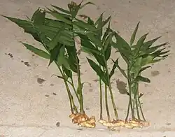 Ginger produces clusters of white and pink flower buds that bloom into yellow flowers. Because of its aesthetic appeal and the adaptation of the plant to warm climates, it is often used as landscaping around subtropical homes. It is a perennial reed-like plant with annual leafy stems, about a meter (3 to 4 feet) tall. Traditionally, the rhizome is gathered when the stalk withers; it is immediately scalded, or washed and scraped, to kill it and prevent sprouting. The fragrant perisperm of the Zingiberaceae is used as sweetmeats by Bantu, and also as a condiment and sialogogue.[30]