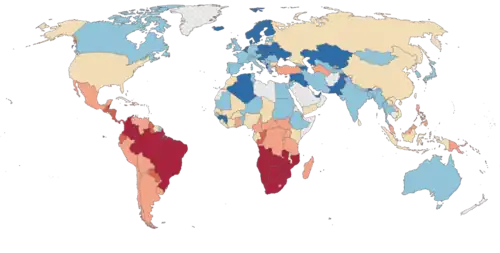Corrado Gini proposed the Gini coefficient as a measure of inequality of income or wealth.[5] For OECD countries in the late 20th century, considering the effect of taxes and transfer payments, the income Gini coefficient ranged between 0.24 and 0.49, with Slovakia being the lowest and Mexico the highest.[6] African countries had the highest pre-tax Gini coefficients in 2008–2009, with South Africa having the world's highest, estimated to be 0.63 to 0.7.[7][8] However, this figure drops to 0.52 after social assistance is taken into account and drops again to 0.47 after taxation.[9] Slovakia has the lowest Gini coefficient, with a Gini coefficient of 0.232.[10] Various sources have estimated the Gini coefficient of the global income in 2005 to be between 0.61 and 0.68.[11][12]