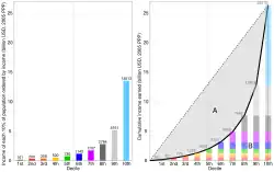 The Gini coefficient measures the inequality among the values of a frequency distribution, such as income levels. A Gini coefficient of 0 reflects perfect equality, where all income or wealth values are the same. In contrast, a Gini coefficient of 1 (or 100%) reflects maximal inequality among values, where a single individual has all the income while all others have none.[3][4]