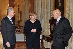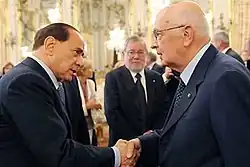 In 2005, Napolitano was appointed a senator for life in Italy by then president Carlo Azeglio Ciampi.[11] In the May 2006 Italian presidential election, he was elected by the Italian Parliament as president of Italy. A pro-Europeanist,[12] Napolitano was the first former Communist to hold said office.[11] During his first term in office, he oversaw governments both of the centre-left coalition, such as the second Prodi government, and the centre-right coalition, such as the fourth Berlusconi government.[13] In November 2011, Silvio Berlusconi resigned as prime minister of Italy amid financial and economic problems. In keeping with his constitutional role, Napolitano then asked former European commissioner Mario Monti to form a cabinet,[14] which critics referred to as a "government of the president".[15]