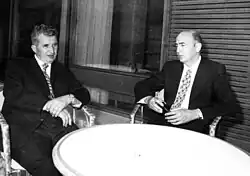 In the mid-1970s, Napolitano was invited by the Massachusetts Institute of Technology to give a lecture; the United States ambassador to Italy, John A. Volpe, refused to grant Napolitano a visa on account of his membership of the PCI. Between 1977 and 1981, Napolitano had some secret meetings with the United States ambassador Richard N. Gardner, at a time when the PCI was seeking contact with the US administration, in the context of its definitive break with its past relationship with the Communist Party of the Soviet Union and the beginning of Eurocommunism, the attempt to develop a theory and practice more adapted to the democratic countries of Western Europe. He was an active member of the party until it ended in 1991.[58] In 2006, when Napolitano was elected president of the Italian Republic, Gardner stated to the Associated Press Television News that he considered Napolitano "a real statesman", "a true believer in democracy", and "a friend of the United States [who] will carry out his office with impartiality and fairness".[59]