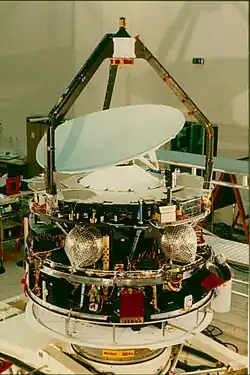 The cylindrical spacecraft was 1.87 m in diameter 2.85m long.[16] It had and had three internal platforms. Built by British Aerospace in Filton, Bristol, it carried a dust shield (Whipple shield) as proposed by Fred Whipple. The shield comprised a thin (1 mm) aluminium sheet separated by a space and a thicker (12 mm) Kevlar sheet.[17] The later Stardust spacecraft would use a similar Whipple shield. Giotto also had a 1.51 m diameter antenna that it used to communicate with Earth.[17] The craft was painted white using an electively conductive paint developed by Centre national d'études spatiales.[18]