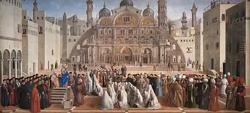 Giovanni Bellini (Italian: [dʒoˈvanni belˈliːni];[1][2] Venetian: Zuane Belin; c. 1430 – 29 November 1516)[3] was an Italian Renaissance painter, probably the best known of the Bellini family of Venetian painters. He was raised in the household of Jacopo Bellini, formerly thought to have been his father, but now that familial generational relationship is questioned.[4] An older brother, Gentile Bellini was more highly regarded than Giovanni during his lifetime, but the reverse is true today. His brother-in-law was Andrea Mantegna.