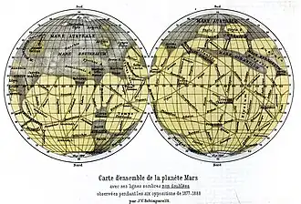 Among Schiaparelli's contributions are his telescopic observations of Mars. In his initial observations, he named the "seas" and "continents" of Mars. During the planet's "great opposition" of 1877, he observed a dense network of linear structures on the surface of Mars, which he called canali in Italian, meaning "channels", but the term was mistranslated into English as "canals".[9]
