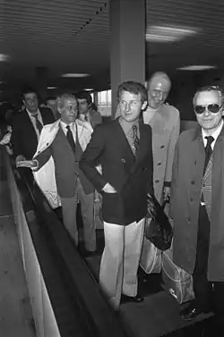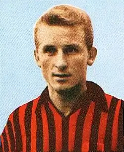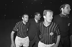 Born in Cusano Milanino near Milan, Trapattoni had a successful career as a player with AC Milan, playing either as a central defender or as a defensive midfielder with the main task of passing the ball to more creative players such as Giovanni Lodetti and Gianni Rivera. He won two Serie A titles (1961–1962, 1967–1968) and two European Cups (1962–1963, 1968–1969) during his time with Milan, and was one of the stars of the 1963 European Cup Final against Benfica, successfully man-marking Eusébio in the second half.[8] Similarly, in the team's 4–1 victory in the 1969 European Cup Final against Ajax, he drew praise in the Italian media for his defending and ability to nullify the offensive threat of Johan Cruyff.[9][10]