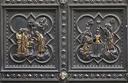 Villani was sent on another diplomatic mission in 1329, this time to Bologna to meet Cardinal Bertrand de Pouget.[9] From 1330 to 1331 he superintended the making of Andrea Pisano's bronze doors for the Baptistry.[2][9] At the same time, he served as the consul for his guild of the Arte di Calimala and watched over the raising of the campanile of the Badìa.[19] He was also sent with others as a hostage to Ferrara, to ensure that Florence made good on a debt; he resided there for some months in 1341.[20]