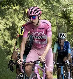 In 2024, Tadej Pogačar, from Slovenia, won the race on his debut. He narrowly lost out on the lead after the first stage to Jhonatan Narváez,[64] but took the pink jersey on the second stage and held it until the end. Pogačar executed a dominant victory, with a winning margin of almost 10 minutes, the mountains classification and 6 stage wins.[65] The winning margin of 9:56 over his closest competitor, Daniel Martínez was the biggest since the 1965 edition and the fourth largest in the post-World War II era. Pogačar went on to win the 2024 Tour de France, becoming the first rider to win both the Giro and Tour in the same year since Marco Pantani in 1998.[66]
