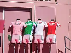 The first year the points classification was used, it had no jersey that was given to the leader of the classification. In the 1967 Giro d'Italia, the red jersey was added for the leader of the classification.[13] However, in 1969 the red jersey was changed to a cyclamen (purple) colored jersey.[10][13] It remained that color until 2010 when the organizers chose to change the jersey back to the color red in a return to the original color scheme for the three minor classifications, which reflected the colors of the Italian flag.[80] However, in April 2017 RCS Sport, the organisers of the Giro, announced that the maglia ciclamino would be revived for the 2017 Giro d'Italia.[81]