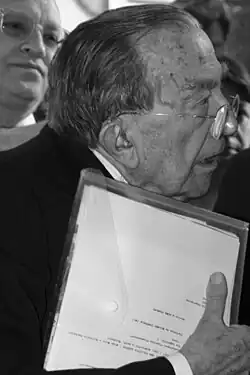 In July 1943, Andreotti contributed, along with Mario Ferrari Aggradi, Paolo Emilio Taviani, Guido Gonella, Giuseppe Capogrossi, Ferruccio Pergolesi, Vittore Branca, Giorgio La Pira, Giuseppe Medici and Moro, to the creation of the Code of Camaldoli, a document planning of economic policy drawn up by members of the Italian Catholic forces. The Code served as inspiration and guideline for economic policy of the future Christian Democrats.[21][22] In 1944, he became a member of the National Council of the newborn Christian Democracy party. After the end of the conflict, he became responsible for the party's youth organisation.[16]