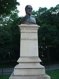 In London, Mazzini resided at 155 North Gower Street, near Euston Square, which is now marked with a commemorative blue plaque.[54] A plaque on Laystall Street in Clerkenwell, London's Little Italy during the 1850s, also pays tribute to Mazzini, calling him "The Apostle of Modern Democracy".[55] Mazzini was an important influence on British idealists such as Thomas Hill Green, and other important figures at the University of Oxford (e.g., Benjamin Jowett and Algernon Swinburne) and the University of Cambridge (e.g., Henry Sidgwick).[56] A bust of Mazzini is in New York's Central Park between 67th and 68th streets just west of the West Drive. The 1973–1974 academic year at the College of Europe was named in his honour.