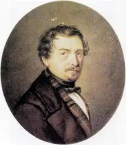 Verdi had been admonished by the poet Giuseppe Giusti for turning away from patriotic subjects, the poet pleading with him to "do what you can to nourish the [sorrow of the Italian people], to strengthen it, and direct it to its goal."[56] Cammarano suggested adapting Joseph Méry's 1828 play La Bataille de Toulouse, which he described as a story "that should stir every man with an Italian soul in his breast".[57] The premiere was set for late January 1849. Verdi travelled to Rome before the end of 1848. He found that city on the verge of becoming a (short-lived) republic, which commenced within days of La battaglia di Legnano's enthusiastically received premiere. In the spirit of the time were the tenor hero's final words, "Whoever dies for the fatherland cannot be evil-minded".[58]