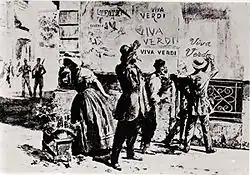 The growth of the "identification of Verdi's music with Italian nationalist politics" perhaps began in the 1840s.[99] In 1848, the nationalist leader Giuseppe Mazzini (whom Verdi had met in London the previous year) requested Verdi (who complied) to write a patriotic hymn.[100] The opera historian Charles Osborne describes the 1849 La battaglia di Legnano as "an opera with a purpose" and maintains that "while parts of Verdi's earlier operas had frequently been taken up by the fighters of the Risorgimento...this time the composer had given the movement its own opera".[101] It was not until 1859 in Naples, and only then spreading throughout Italy, that the slogan "Viva Verdi" was used as an acronym for Viva Vittorio Emanuele Re D'Italia ("Long live Victor Emmanuel II, King of Italy"), in reference to the then king of Sardinia and future king of Italy.[102] After Italy was unified in 1861, many of Verdi's early operas were increasingly re-interpreted as Risorgimento works with hidden revolutionary messages that perhaps had not been originally intended by either the composer or his librettists.[103]