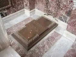 Verdi was initially buried in a private ceremony at Milan's Cimitero Monumentale.[137] A month later, his body was moved to the crypt of the Casa di Riposo. On this occasion, "Va, pensiero" from Nabucco was conducted by Arturo Toscanini with a chorus of 820 singers. A huge crowd was in attendance, estimated at 300000.[138] Boito wrote to a friend, in words which recall the mysterious final scene of Don Carlos, "[Verdi] sleeps like a King of Spain in his Escurial, under a bronze slab that completely covers him."[139]