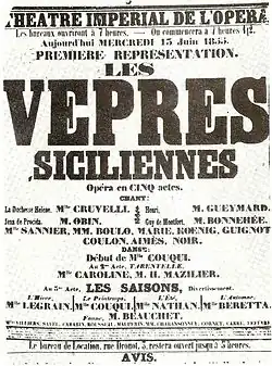 In the winter of 1851–52, Verdi decided to go to Paris with Strepponi, where he concluded an agreement with the Opéra to write what became Les vêpres siciliennes, his first original work in the style of grand opera. In February 1852, the couple attended a performance of Alexander Dumas fils's play The Lady of the Camellias; Verdi immediately began to compose music for what would later become La traviata.[80]
