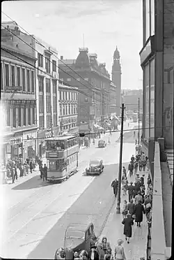 During the First World War, Glasgow raised 28 new battalions of men. By the end of the conflict, approximately 18,000 Glaswegian soldiers had been lost.[56] As so many men left their jobs to join up, women were employed in shipyards, munitions factories and other industries and contributed a vital service to the war effort. In 1917, this was acknowledged publicly when King George V presented an OBE to a munitions worker, Lizzie Robertson, who was cheered by many other female munitions workers, during a ceremony held in Ibrox Stadium. [57] Women from the city also served with the Scottish Women's Hospitals for Foreign Service; for example, Louisa Jordan, a nurse from Maryhill who was posted to Serbia, and Norah Neilson Gray from Hillhead who served as an orderly in Royaumont.[58] Victoria Crosses were awarded to several Glaswegian men during World War One: Private Henry May,[59] Sergeant Robert Downie,[60] Sergeant John Meikle,[61] drummer Walter Potter Ritchie,[62] Company Serjeant Major John Kendrick Skinner,[63] Doctor Harry Ranken,[64] Sergeant James Youill Turnbull[65] and Lieutenant Donald MacKintosh.[66]