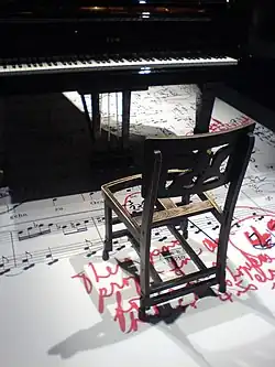 The piano had to be set at a certain height and would be raised on wooden blocks if necessary.[58] A rug would sometimes be required for his feet.[59] He had to sit exactly 14 inches (360 mm) above the floor, and would play concerts only with the chair his father had made. He continued to use the chair even when its seat was completely worn,[60] and became so closely identified with it that it is displayed in a glass case at Library and Archives Canada.