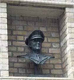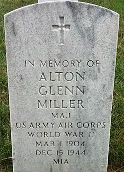 Miller went missing in action (MIA) on December 15, 1944, on a flight over the English Channel from England to France.[1] In keeping with standard operating procedure for the US military services, he was officially declared dead a year and a day later.[16][1][17] An Army investigation led to an official finding of death (FOD) for Miller, Norman Baessell, and John Morgan, all of whom died on the same flight.[18] All three officers are listed on the Tablets of the Missing at Cambridge American Cemetery and Memorial in Cambridge, England.[1][19] Since his body was not recoverable, Miller was allowed to have a memorial headstone placed at the US Army-operated Arlington National Cemetery.[1][20][21][22][23][24] In February 1945, he was posthumously awarded the Bronze Star Medal.[1]