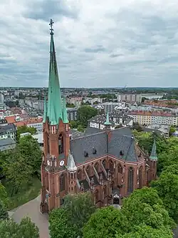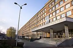 Gliwice is the westernmost city of the Metropolis GZM, a conurbation of 2.0 million people, and is the third-largest city of this area, with 175,102 permanent residents as of 2021.[1] It also lies within the larger Katowice-Ostrava metropolitan area which has a population of about 5.3 million people and spans across most of eastern Upper Silesia, western Lesser Poland and the Moravian-Silesian Region in the Czech Republic. Gliwice is bordered by three other cities and towns of the metropolitan area: Zabrze, Knurów and Pyskowice. It is one of the major college towns in Poland, thanks to the Silesian University of Technology, which was founded in 1945 by academics of Lwów University of Technology. Over 20,000 people study in Gliwice.[4] Gliwice is an important industrial center of Poland. Following an economic transformation in the 1990s, Gliwice shifted from steelworks and coal mining to automotive and machine industry.