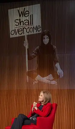 In 1968, Steinem signed the "Writers and Editors War Tax Protest" pledge, vowing to refuse tax payments in protest against the Vietnam War.[56] The following year, her article "After Black Power, Women's Liberation"[57] brought her to national fame as a feminist leader.[6] As such she campaigned for the Equal Rights Amendment, testifying before the Senate Judiciary Committee in its favor in 1970.[58][59] That same year she published her essay on a utopia of gender equality, "What It Would Be Like If Women Win", in Time magazine.[60]