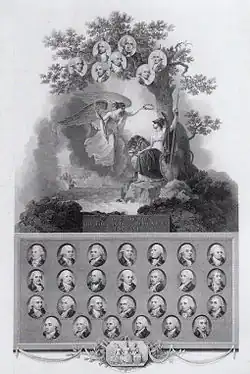 In Britain, the fleet in Spithead was treated with a Royal visit by King George III and the entire royal household.[59] Numerous honours were bestowed on the fleet and its commanders. Admiral Howe, already an earl, refused any further elevation, and one of Howe's political opponents dissuaded King George III from making him a Knight of the Garter.[93] Vice-Admiral Graves was elevated to the Peerage of Ireland as Baron Graves, while Vice-Admiral Hood was made Viscount Bridport.[m] Rear-Admirals Bowyer, Gardner, Pasley and Curtis (the last-named was promoted from captain on 4 July 1794) were all made baronets, and Bowyer and Pasley also received pensions of £1,000 a year to compensate them for their severe wounds.[93] All first lieutenants were promoted to commander and numerous other officers were promoted in consequence of their actions. The thanks of parliament were unanimously passed to all who fought at the action and various other gifts and awards were distributed among the fleet.[94] A memorial to Captains John Hutt and John Harvey, both of whom had died of their wounds on 30 June, was raised in Westminster Abbey.[56]