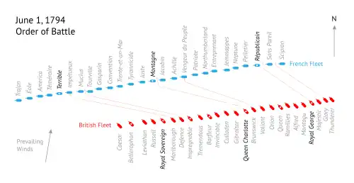 It was normal in fleet actions of the 18th century for the two lines of battle to pass one another sedately, exchanging fire at long ranges and then wearing away, often without either side losing a ship or taking an enemy.[43] In contrast, Howe was counting on the professionalism of his captains and crews combined with the advantage of the weather gage to attack the French directly, driving through their line.[18] However, this time he did not plan to manoeuvre in the way he had during the two previous encounters, each ship following in the wake of that in front to create a new line arrowing through his opponent's force (as Rodney had done at the Battle of the Saintes 12 years earlier).[44] Instead, Howe ordered each of his ships to turn individually towards the French line, intending to breach it at every point and rake the French ships at both bow and stern. The British captains would then pull up on the leeward side of their opposite numbers, cutting them off from their retreat downwind, and engage them directly, hopefully forcing each to surrender and consequently destroying the French Atlantic Fleet.[38]