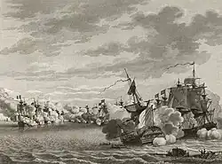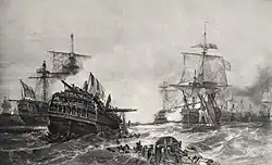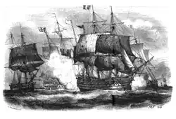 Despite Howe's pursuit, the main French sortie found initial success, running into a Dutch convoy and taking 20 ships from it on Villaret's first day at sea. For the next week Howe continued to follow the French, seizing and burning a trail of French-held Dutch ships and enemy corvettes.[33] On 25 May Howe spotted a straggler from Villaret's fleet and gave chase; Audacieux led Howe straight to his opponent's location.[34] Having finally found Villaret, on 28 May Howe attacked, using a flying squadron of his fastest ships to cut off its rearmost vessel Révolutionnaire. This first rate was at various times engaged with six British ships and took heavy damage, possibly striking her colours late in the action.[35] As darkness fell the British and French fleets separated, leaving Révolutionnaire and her final enemy, HMS Audacious, still locked in combat behind them. These two ships parted company during the night and eventually returned to their respective home ports.[36] By this stage Villaret knew through his patrolling frigates that the grain convoy was close, and deliberately took his fleet to the west, hoping to decoy Howe away from the vital convoy.[11]