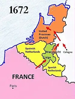 Instead, Louis attempted to intimidate the States General, and on 9 September, his envoy D'Avaux handed them two letters. The first warned an attack on James meant war with France, the second any interference with French operations in Germany would end with the destruction of the Dutch state.[63] Both misfired; convinced Louis was trying to drag him into war, James told the Dutch there was no secret Anglo-French alliance against them, although his denials only increased their suspicions. By confirming France's primary objective was the Rhineland, the second allowed William to move troops from the eastern border to the coast, even though most of the new mercenaries had yet to arrive.[64]