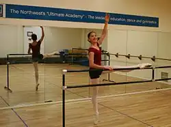 Exercising at a portable barre. A fixed barre can be seen in the background.