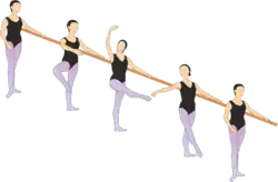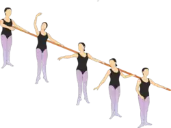 A sturdy horizontal bar, approximately waist height, used during ballet warm-up exercises and training. Fixed barres are typically mounted on