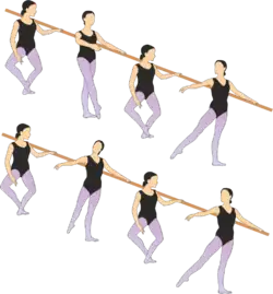 Demi-grand rond de jambe (en l'air): the leg is extended and sustained off the ground while moving from fourth devant or derrière to second or vice versa, thus drawing only half of the full semi-circle.[12]