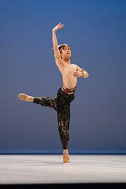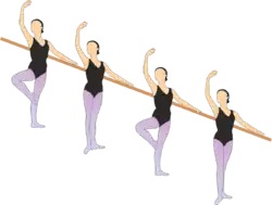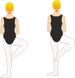 In dance (particularly ballet), arabesque (French: [aʁabɛsk]; literally, "in Arabic fashion") is a body position in which a dancer stands on one leg (the supporting leg) with the other leg (the working leg) extended, straight, behind the body. The arm positions can vary and are generally allongé. The foot of the supporting leg may be flat on the floor, on the ball of the foot (demi-pointe/relevé), or on the tips of the toes (en pointe).