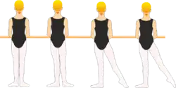 (French pronunciation:[ʁɔ̃d(ə)ʒɑ̃b]; meaning 'leg circle.') Half-circle made by the pointed foot, from fourth front or back through second position to the opposite fourth and returning through first position again to repeat, in effect tracing out the letter "D". Starting front going back is called rond de jambe en dehors while starting back and going front is called rond de jambe en dedans.[10][11]
