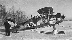 During the Winter War, the Finnish Air Force (FAF) obtained 30 Mk II fighters from the UK. Ten of the aircraft were donated, while the other 20 were bought by the FAF; all were delivered between 18 January and 16 February 1940, the first entering service on 2 February 1940.[29][30] The Finnish Gladiators served until 1945, but they were outclassed by modern Soviet fighters during the Continuation War, and the aircraft was mostly used for reconnaissance from 1941. The Finnish Air Force obtained 45 aerial victories by 22 pilots with the aircraft during the Winter War and one victory during the Continuation War. Twelve Gladiators were lost in combat during the Winter War and three during the Continuation War.[29] Two pilots became aces with this aircraft: Oiva Tuominen (6.5 victories with Gladiators) and Paavo Berg (five victories).