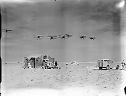 Before the outbreak of hostilities in Iraq, No. 4 Service Flying Training School RAF at Habbaniya operated three old Gladiators as officers' runabouts. With the increased tension, the base was reinforced with another six Gladiators on 19 April, flying in from Egypt.[88] During the early part of the war, these nine Gladiators flew numerous sorties against air and ground targets, taking off from the base's polo field.[89] The RAF's Gladiator force in Iraq was further reinforced when, on 11 May, another five aircraft arrived, this time from 94 Squadron in Ismaïlia on the Suez Canal.[90][76] A last resupply of Gladiators came on 17 May in the form of four more 94 Squadron aircraft.[91]