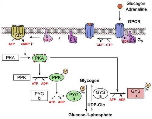 Adenylate cyclase manufactures cyclic adenosine monophosphate (cyclic AMP or cAMP), which activates protein kinase A (cAMP-dependent protein kinase). This enzyme, in turn, activates phosphorylase kinase, which then phosphorylates glycogen phosphorylase b (PYG b), converting it into the active form called phosphorylase a (PYG a). Phosphorylase a is the enzyme responsible for the release of glucose 1-phosphate from glycogen polymers. An example of the pathway would be when glucagon binds to a transmembrane protein. The transmembrane proteins interacts with Gɑβ𝛾. Gαs separates from Gβ𝛾 and interacts with the transmembrane protein adenylyl cyclase. Adenylyl cyclase catalyzes the conversion of ATP to cAMP. cAMP binds to protein kinase A, and the complex phosphorylates glycogen phosphorylase kinase.[22] Phosphorylated glycogen phosphorylase kinase phosphorylates glycogen phosphorylase. Phosphorylated glycogen phosphorylase clips glucose units from glycogen as glucose 1-phosphate.
