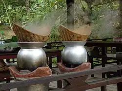 Steaming sticky rice in traditional baskets or houat