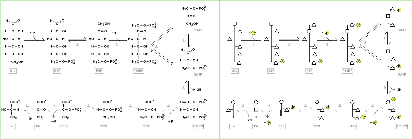 Structure of glycolysis components in skeletal diagram and conservation-of-matter model