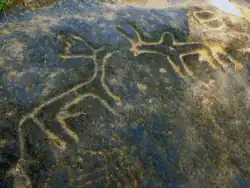 Rock art engravings found in Goa are one of the earliest known traces of human life in India.[25] Goa, situated within the Shimoga-Goa Greenstone Belt in the Western Ghats (an area composed of metavolcanics, iron formations, and ferruginous quartzite), yields evidence for Acheulean occupation.[26] Rock art engravings (petroglyphs) are present on laterite platforms and granite boulders in Usgalimal, near the west-flowing Kushavati river, and in Kajur.[27] In Kajur, the rock engravings of animals, tectiforms, and other designs in granite have been associated with what is considered to be a megalithic stone circle, with a round granite stone in the centre.[28] Petroglyphs, cones, stone-axe, and choppers dating to 10,000 years ago have been found in various locations in Goa, including Kazur, Mauxim, and the Mandovi-Zuari basin.[29] Recently, these petroglyphs have been included in the tentative list of UNESCO world heritage sites.