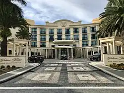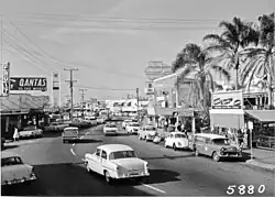 After the establishment of the Surfers Paradise Hotel in the late 1920s, the Gold Coast region grew significantly.[26][27] The Gold Coast was originally known as the South Coast (because it was south of Brisbane). However, over-inflated prices for real estate and other goods and services led to the nickname of "Gold Coast" from 1950.[28][29][30][31][32] South Coast locals initially considered the name "Gold Coast" derogatory.[33][34] However, soon the "Gold Coast" simply became a convenient way to refer to the holiday strip from Southport to Coolangatta.[35][36][37][38][39] The Town of South Coast was formed through the amalgamation of Town of Coolangatta and Town of Southport along with the coastal areas (such as Burleigh Heads) from the Shire of Nerang on 17 June 1949,[40] with the effect of having the present-day Gold Coast coastal strip as a single local government area. As the tourism industry grew into the 1950s, local businesses began to adopt the term Gold Coast in their names, and on 23 October 1958 the Town of South Coast was renamed Town of Gold Coast.[41] The area was proclaimed a city, less than one year later on 16 May 1959.[42]