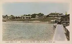 A number of small townships developed along the coast and in the hinterland. The western suburb of Nerang was surveyed and established as a base for the industry and by 1870 a town reserve had been set aside.[21] By 1873, the town reserve of Burleigh Heads had also been surveyed and successful land sales had taken place.[22] In 1875, the small settlement opposite the boat passage at the head of the Nerang River, known as Nerang Heads or Nerang Creek Heads, was surveyed and renamed Southport, with the first land sales scheduled to take place in Beenleigh.[23] Southport quickly grew a reputation as a secluded holiday destination for wealthy Brisbane residents.[24]
