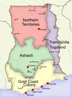 The Gold Coast was a British Crown colony on the Gulf of Guinea in West Africa from 1821 until its independence in 1957 as Ghana.[3] The term Gold Coast is also often used to describe all of the four separate jurisdictions that were under the administration of the Governor of the Gold Coast. These were the Gold Coast itself, Ashanti, the Northern Territories protectorate and the British Togoland trust territory.[4]